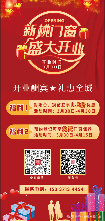 在这个春意盎然的季节,新桃门窗为您打造一个温馨舒适的家居环境。截止2025年4月30日前,选择新桃门窗进行封阳台或更换窗户的客户,即可享受9.5折优惠。我们深知,每一扇门窗都是家的眼睛,每一次更换都是对生活品质的提升。新桃门窗,让您的家焕然一新,尽享春光。